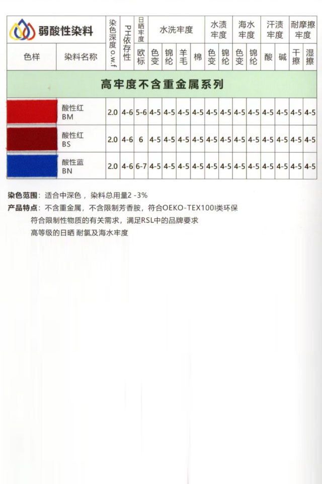 高牢度分散染料作為合成纖維染色的核心材料,以分子結構小、不含水溶性基團為特征,需借助分散劑實現均勻染色。其技術特性聚焦于色牢度提升,涵蓋耐洗、耐光、耐摩擦、耐升華等多維度性能,采用五級制評級體系(耐光牢度為八級),級數越高代表性能越優。例如,蒽醌結構染料因分子穩定性高,耐曬、耐熱性能顯著;偶氮…